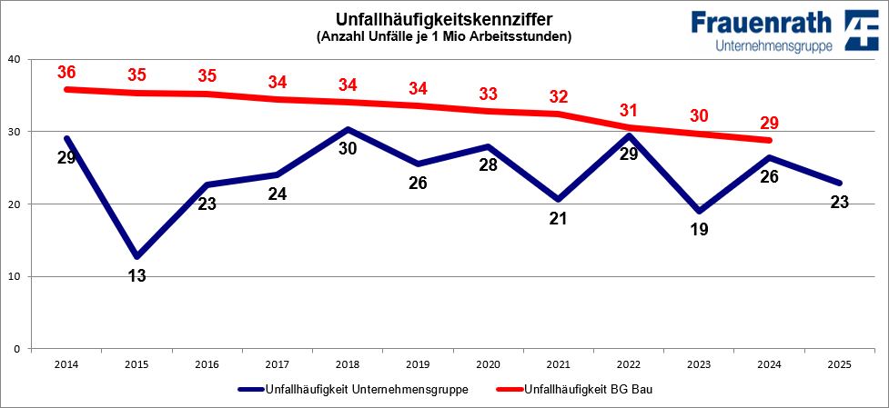 Diese Zielsetzung haben wir seit über 10 Jahren erreicht, so haben wir für das Jahr 2025 eine Unfallhäufigkeitskennziffer von insgesamt 23 für unsere Standorte in Heinsberg und Großröhrsdorf ermittelt.