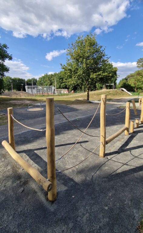 Es handelt sich um eine niedrigschwellige Balancieranlage, die speziell so konzipiert ist, dass auch Kinder mit Gleichgewichtsstörungen sie sicher nutzen können. Als Bodenbelag wird hier zukünftig noch Kokosfaser eingebaut, damit der Boden auch für Menschen im Rollstuhl befahrbar wird.